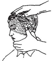 包扎方法:先在伤口上覆盖无菌纱布(所有伤口包扎前在创面均需先覆盖无菌纱布,若现场没有无菌纱布时可用消毒餐巾纸代替),将三角巾底边回折1 cm 后放在伤员眉间上部,顶角经头部拉到头后枕部,将底边经耳上向后拉紧压住顶角,然后抓住两个底角在枕部交叉返回到额部中央打结(图2-89)。