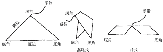 (1)有关三角巾基本知识:将一边长为1m 的正方形布沿对角线一裁为二,即成两块三角巾。这条对角线即为三角巾的底边,两条直角边即为三角巾的腰边,直角即为三角巾的顶角。顶角系有系带。为了方便不同部位的包扎,可将三角巾折叠成带状,称为带状三角巾,或将三角巾在顶角附近与底边重点折叠成燕尾状,称为燕尾式三角巾(图2-88)。