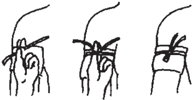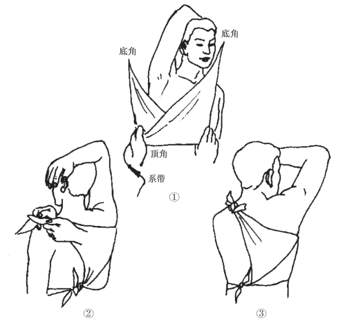 包扎方法:将三角巾叠成宽带状放于下颌,两手将带巾两底角分别经耳后向上提,长的一端绕过头顶与短的一端在一侧颞部交叉成十字,然后两端水平环绕头部经额、颞、耳上、枕部与另一端打结固定(图2-92)。