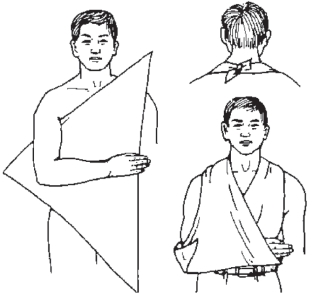包扎方法:先将前臂与一木棒(比前臂2 关节间距离长)固定(上三道固定带,先上中间1 道,再上两端2 道),将手臂弯曲成85°,将三角巾放置于胸前,三角巾底边放于健臂一侧并与地面相垂直,受伤手臂置于三角巾外侧;将下面一底角拉起,绕过伤者头颈与另一底角打结;将三角巾系带拉向受伤手臂的手部上方,与三角巾底边缠绕打结(图2-94)。