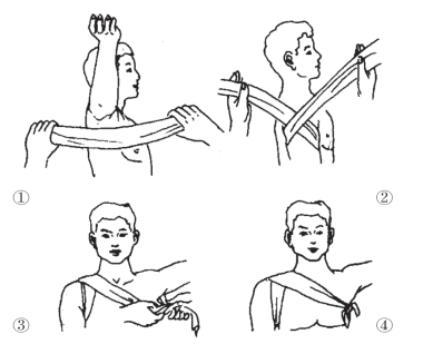6)手臂受伤包扎法:适用于一侧手臂受伤(前臂骨折等)。