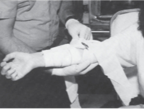 (2)加压包扎止血法:加压包扎止血法就是伤口覆盖无菌敷料后,再在无菌敷料上面放一棉垫,然后再用绷带、三角巾等紧紧包扎,以停止出血为度。这种方法用于小动脉以及静脉或毛细血管的出血。但伤口内有碎骨片时禁用此法,以免加重损伤。一般适用于四肢较浅的表皮裂伤。加压包扎止血法的操作方法见图2-84。