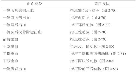 (1)指压止血法:较大的动脉出血后,用拇指压住出血的血管上方(近心端),使血管被压闭住,中断血流(图2-74)。几种常用的指压止血法见表2-3。