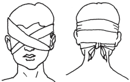 包扎方法:将三角巾折成宽带状,中段放在头后枕骨上,两旁分别从耳上拉向眼前,盖住双眼,在鼻梁上方交叉,再持两端分别从耳下拉向头后枕下部打结固定(图2-91)。即使单眼外伤也应该包扎双眼,因为若仅包扎伤眼,健眼仍活动,必然会带动伤眼活动,不利于稳定伤情。