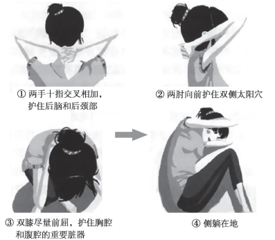 2.自我保护 在拥挤的人群中,双手交叉抱于胸前,保留安全间隙,避免胸部受到挤压,保持呼吸道顺畅并尽量保持身体平衡。或按照图4-47 的方法进行自我保护。