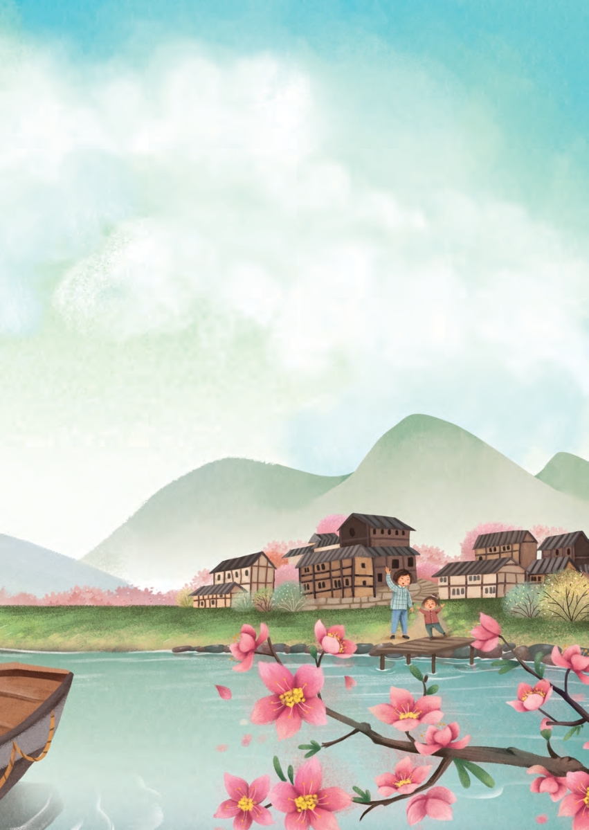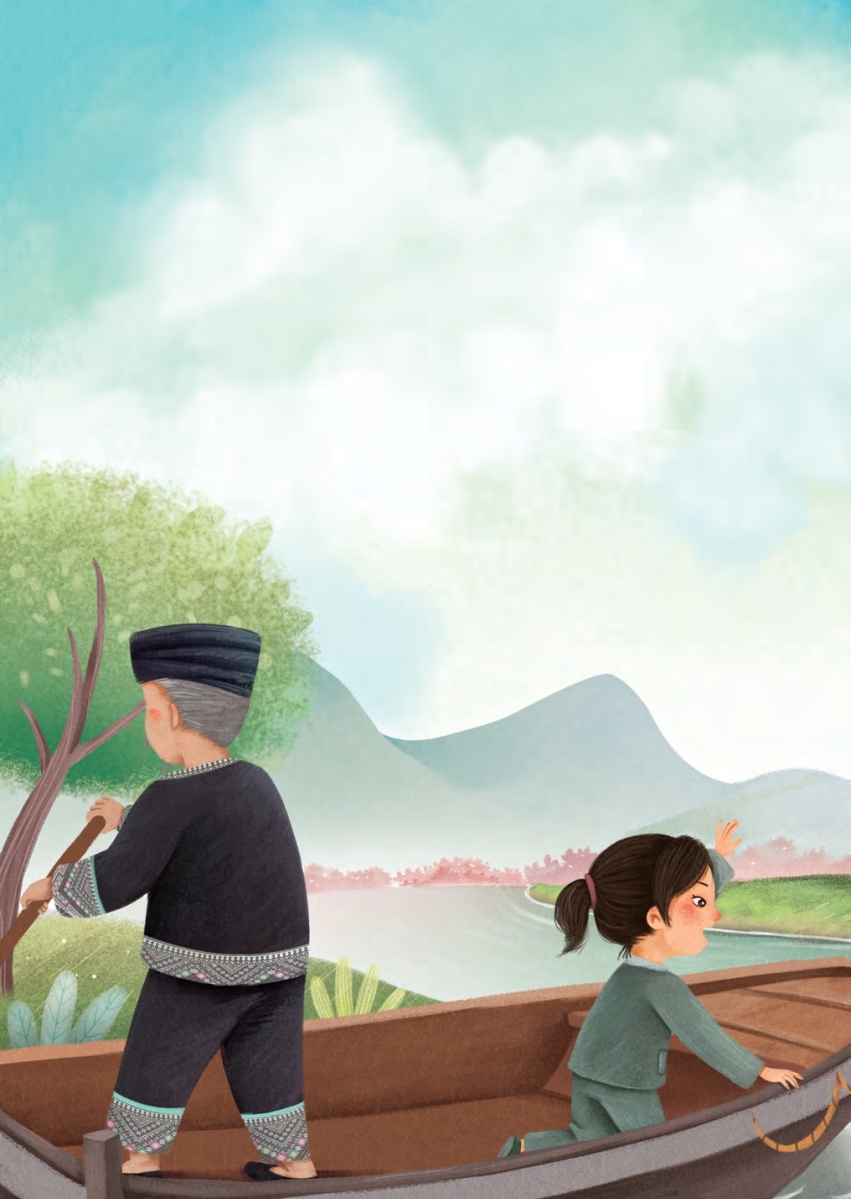 悠悠的河水托着小船缓缓地行着。这条河叫酉(yǒu)水河,河水十分清澈,能看见河底袅(niǎo)袅娜(nuó)娜的水草和灵动的小鱼。河水不徐不疾,在阳光下闪动着碎金细银一般的光。