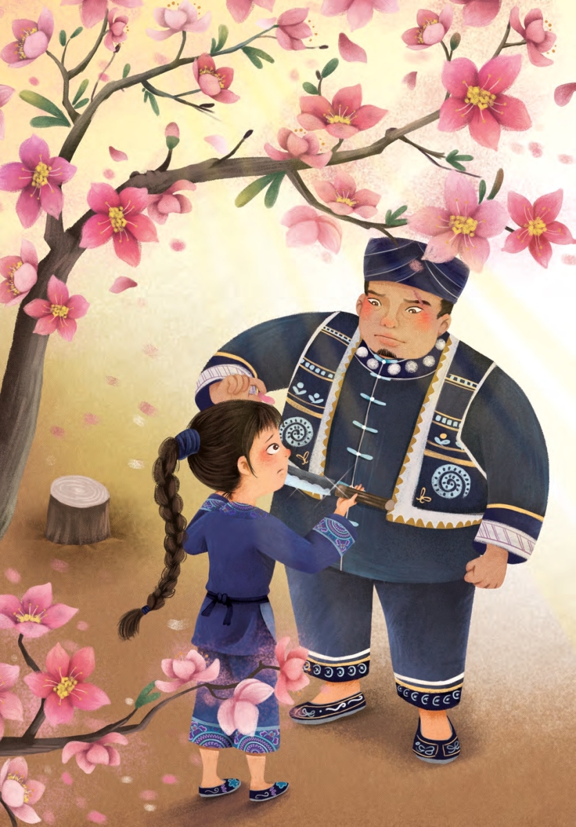 这时,一阵煦(xù)暖的风柔柔地吹过来,树枝轻轻地摇曳着,几片花瓣袅袅地飘下来,有一片恰巧落在阿桃的头发上。阿桃爸神情复杂地盯着那枚花瓣,看着,看着,终于伸出一只粗大的手将花瓣摘掉,转身进屋了。