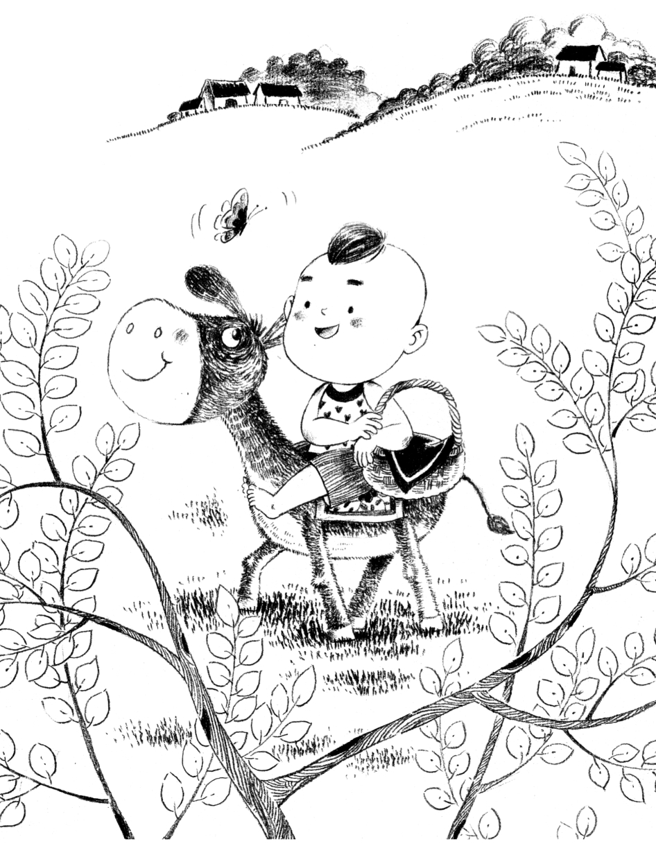 男孩小石头骑在小毛驴的背上,轻轻地哼了一首歌。