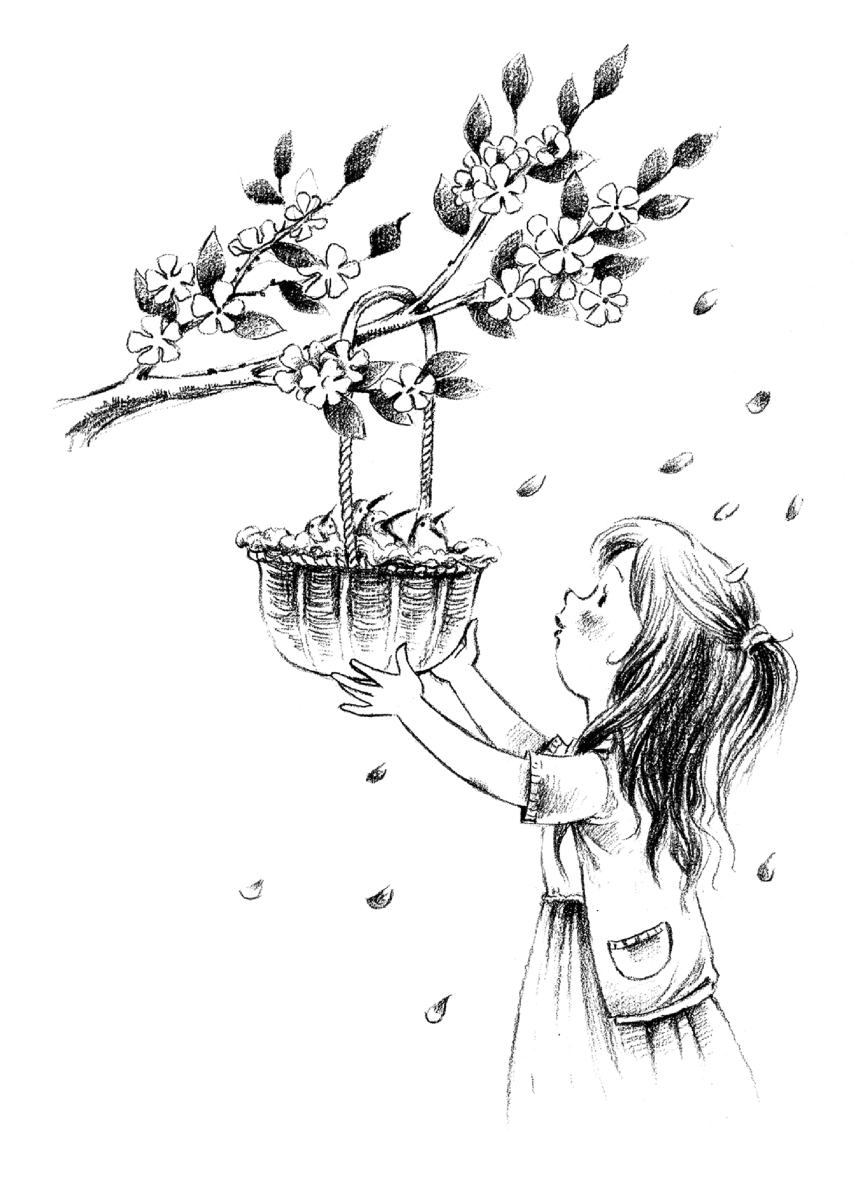 小樱桃找来一个竹篮,垫上棉絮,将小鸟放进去,然后将竹篮挂在了蔷薇花的枝条上。