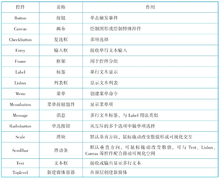 表9-4 Tkinter库包含的各类组件及其功能描述