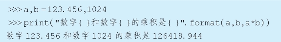 其中,“数字{}和数字{}的乘积是{}”是输出字符串模板,即混合字符串和变量的输出样式。大括号{}表示一个槽位置,括号中的内容由后面紧跟的format()方法中的参数按顺序填充,更多的字符串格式化方法将在第3章深入介绍。