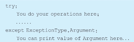 语句中Exception是异常的类型(例如,NameError),参数是一个异常参数值。该参数是可选的,如果不提供,异常的参数是“None”。最后一个参数是可选的(在实践中很少使用),如果存在,是跟踪异常对象。