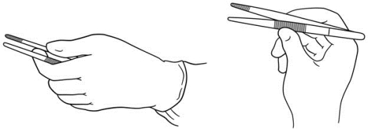 正确的持镊姿势是拇指对示指与中指,把持二镊脚的中部,稳而适度地夹住组织(图2-10)。错误执镊(图2-11)既影响操作的灵活性,又不易控制夹持力度大小。