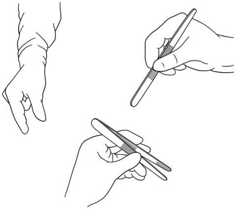 图2-10 手术镊的传递与执镊方法