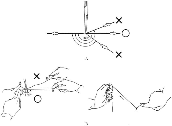 图8-3 A.打结时三点一线;B.持线不应离结扎点过远(○-正确;×-错误)