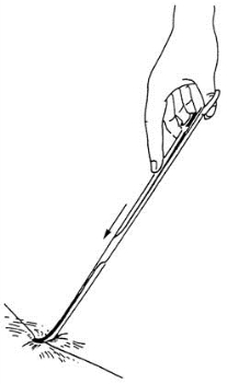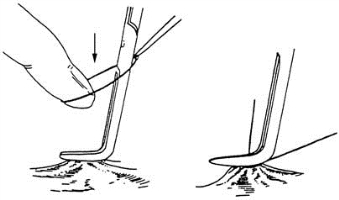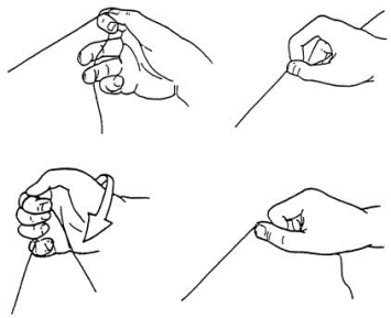必要时可用外科结来打第一个结,以防止肥厚组织的回弹。手指的力量是有限的,结扎较多的肥厚组织,必须用手腕的力量才能扎紧(图8-7)。结扎线穿过脂肪组织会很滑腻,影响用力。可在打第一个结后,由助手用钳子或镊子夹住结节处的结扎线,防止回弹松脱。其实很多时候不必做大块的肥厚组织结扎,切开组织浆膜,分出血管同样可以达到止血目的。如果觉得断端需结扎,可再加缝扎一次。