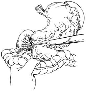 (2)处理:如果是门静脉高压,门静脉血经胃左静脉侧流至食管下段静脉时,必须结扎出血处的门静脉侧,以阻断血流。没有肝硬化时结扎食管侧静脉可止血(图8-24)。破口难以寻找时,可向小网膜孔插入手指,从背侧向前压迫肝十二指肠韧带内的门静脉可获得止血,再找到出血处,从破口的两端,结扎处理。