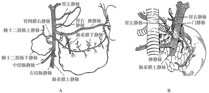 图8-21 胃网膜右静脉与周围静脉的解剖位置