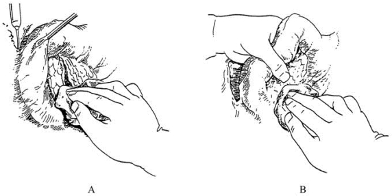 (2)处理:首先用纱布压住出血部位,然后切开十二指肠侧腹膜,使胰头十二指肠松动。左手从背侧握住胰头及十二指肠,从背侧压迫静脉可以止血(但压迫力量过大的话,可使肠系膜上静脉淤血,使出血加重)。除去压迫止血的纱布,吸净积血,寻找发现破损处。静脉壁部分损伤常呈鱼口状裂开,只要压迫裂口的远心侧,即可阻断血流止血。找到该静脉后结扎止血(图8-22)。