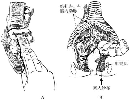 结扎双侧髂内动脉可减少出血,并加纱布填塞,用于上述方法均不能止血者。此时应终止手术或改为姑息性手术(切除癌块,或关闭远端结肠,乙状结肠造口),以保全生命。有可能的话,填塞的纱布可在直肠侧方的会阴分出隧道从会阴部引出。术后3d开始在手术室内逐段取出,以后每天取出部分,1周内取尽,并引流残腔(图8-30)。