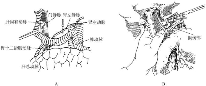 胃癌根治术在显露肝总动脉时,会伤及胃左静脉,因为该静脉是从肝动脉的背侧沿胰腺上缘汇入门静脉的,应尽量避开。如有损伤,应及早结扎切断。