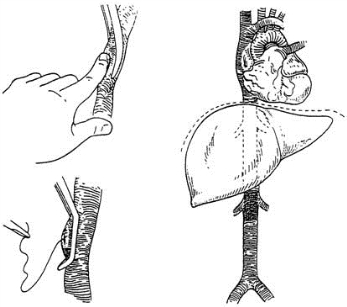 (2)处理:首先用手指指腹压住破口,用心耳钳在手指下夹住受损段部分腔静脉壁,再缝合修补。也可用气囊导管阻断下方血流后进行静脉壁修复。缺损处可用自体静脉补片修复。如果是外伤引起的腔静脉严重损伤无法修复者,在肾静脉以下结扎腔静脉也是可行的(图8-32)。此时回心血量突然减少,血压下降,但并不致命。术后可有暂时的下肢水肿,以后由侧支循环得到代偿。人造血管可以修复腔静脉缺损,应争取条件应用。