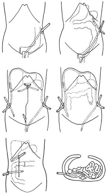 1.小肠手术 一般肠切除,可在腹腔洗净后不放引流。小肠穿孔术后应放多处引流(图11-6)。