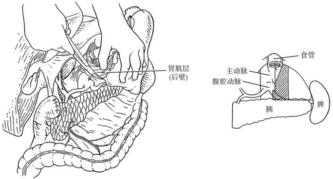 用左手轻轻将脾脏托向上方,用剪刀剪开脾后方的腹膜,并与以前切开的脾结肠韧带处相连接,此处很少有出血。切线向上延到食管前面的腹膜切开线上。这样,脾脏与后腹壁分开,很容易将脾脏托向右上方,并显露出与脾蒂相连接的胰尾背面部分。用手指钝性分离胰尾与后腹壁间的疏松连接,即进入胰背面的层面。用剪刀分离肾前的腹膜壁层,小网膜后壁的最后一部分也被游离出来。胃、脾和胰尾,被游离出的完整的小网膜囊的前壁和后壁包绕着。它们与机体相连的一点仅在脾动、静脉和胰尾处。结扎切除脾动、静脉,清扫血管周围淋巴结,钳夹切断胰尾,全胃的标本即可从术野中移出。全胃切除及淋巴结清扫手术中的切除操作部分即告完成(图14-12)。