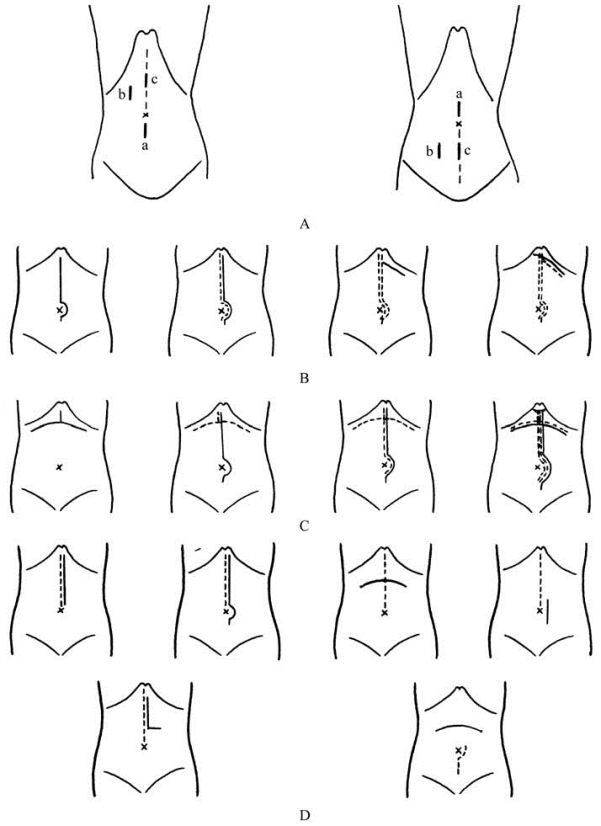 A.小切口探查;B、C、D.上腹部多次手术;┄┄.手术瘢痕;——.再手术切口部位