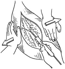 图17-3 用手在切口两侧向外牵开