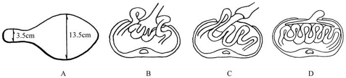 类球形腹部的切开,因张力关系切口呈椭圆形,切口中间距离增大,内脏和脂肪的膨出,腹壁组织的脆弱,筋膜的菲薄和肌肉的萎缩等,都增加了关腹的困难。正常人只要有了良好的肌肉松弛,关腹会很方便。而肥胖病人肌肉收缩力减弱,靠肌松带来关腹的方便,效果并不明显。关键在于如何使膨出的肠管和网膜不影响腹壁的对合和缝合。常常有人在关腹困难时,由助手双手挤压两侧腹壁来缩小切口边缘的距离。这种方法很难奏效,在腹壁切口靠拢的同时,腹腔内容物也被挤出切口外,对肥胖病人并不可取。于是有人设计出一种特殊的扇形压肠板,其作用明显优于普通的长形压肠板和徒手遮挡肠管。扇形压肠板是用医用塑胶片剪制成两端大小不同的相连的心形,放入腹内后可阻挡内容物膨出,随着关腹的进展,自动弯曲合拢,并仍能发挥压肠的作用,直至缝合到腹膜切口末端,可轻易地抽出(图17-7)。