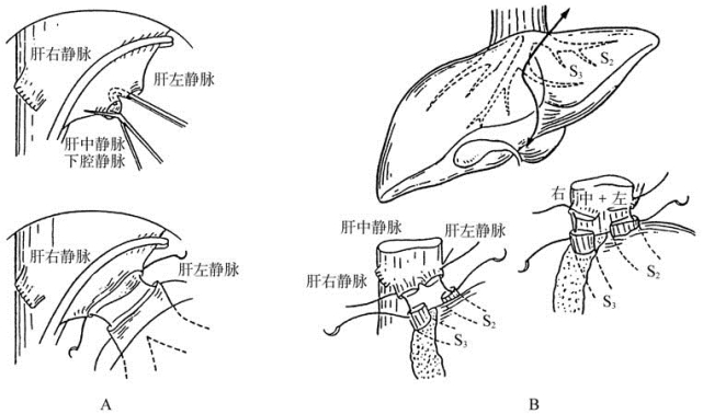 A.与肝左静脉吻合;B.两支肝静脉分别吻合