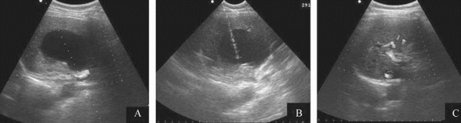 A.肝右叶囊肿;B.超声引导下经皮穿刺硬化治疗;C.术后半年复查囊肿完全消失