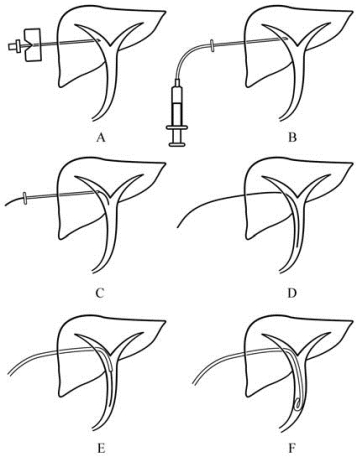 A.影像引导下穿刺针刺入肝内胆管;B.拔出针芯,注射器抽吸确认胆汁回流;C.插入导丝;D.退出穿刺针;E.通过导丝送入引流管;F.退出导丝,外接引流袋