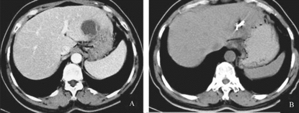 A.治疗前CT;B.治疗后复查脓腔基本消失