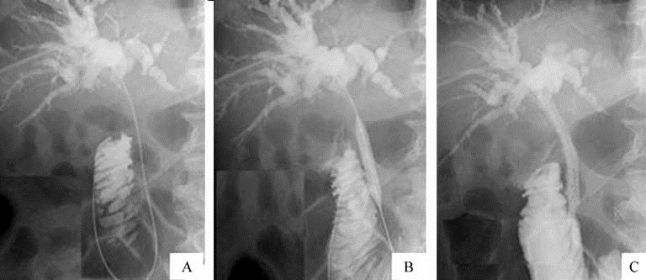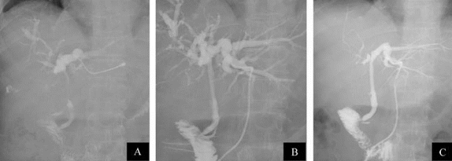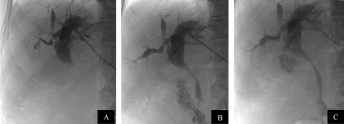 A.肝内胆管扩张,肝总管及胆总管上段狭窄呈细线状,胆总管下段正常;B.同时行支架内引流和置管外引流;C.1周后复查,肝内胆管扩张情况已大为改善,外引流置管可拔除