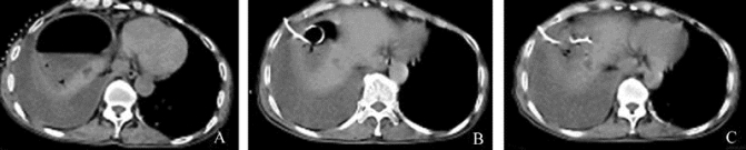 A.治疗前CT示右膈下巨大脓肿,内见气液平面;B.经皮穿刺置管冲洗引流术后1周,脓腔明显缩小;C.治疗后2周复查脓腔基本消失
