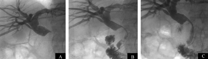A.胆管闭塞;B.开通闭塞段;C.置入支架