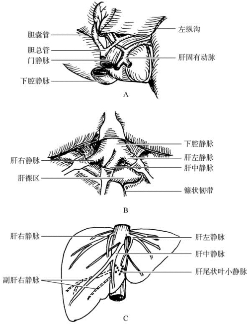 3.肝静脉系 有肝左静脉、肝中静脉和肝右静脉3大支及一些分散的小肝静脉,均直接汇入下腔静脉。肝静脉的表面投影与肝的裂隙基本一致(图29-6)。