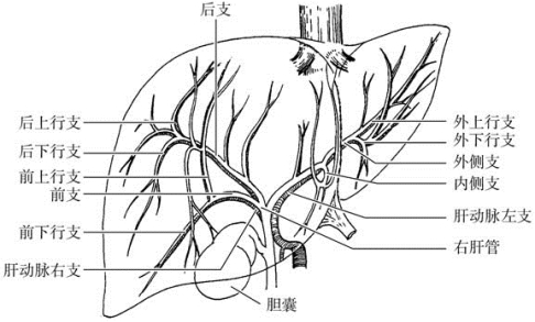 1.动脉系 肝总动脉分出胃十二指肠动脉后即为肝固有动脉,在肝门处分为左右2支,有时有副肝动脉支。肝动脉在肝内的分布进入各肝叶和肝段,如肝右动脉分出右前叶支、右后叶支、胆囊动脉和尾状叶支等(图29-4,图29-5)。
