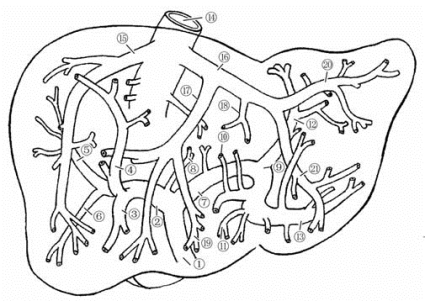 ①门静脉;②~○13门静脉各分支;○14下腔静脉;○15~○21肝静脉各属支