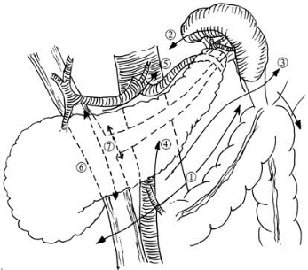 5.淋巴结清扫:清扫肠系膜上动脉周围淋巴结。清扫肝总动脉、胃左动脉、腹腔动脉干和脾动脉周围淋巴结。