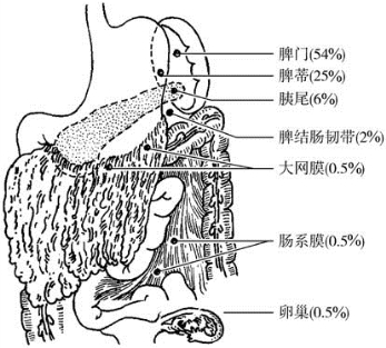 正常人群中10%~15%有副脾,它的色泽、硬度与脾一致,但大小不同。副脾常位于脾胃韧带、胃结肠韧带和脾肾韧带中,但也可以在腹膜、肠系膜、大网膜及盆腔见到(图31-5)。它通常没有临床表现,但在某些已行过脾切除术的溶血性疾病的复发中起重要作用,切除这些病人的副脾可以使疾病缓解。对于最初的脾切除术治疗失败的病人应行99mTc标记的热变性红细胞或111In标记的血小板扫描以确定遗漏的副脾位置。