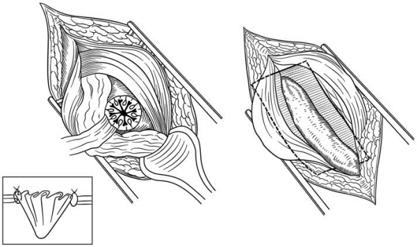 (2)将腹外斜肌腱膜从其下方的腹内斜肌浅面予以游离,其宽度要能容下6~8cm宽的补片,这补片能覆盖腹内斜肌,并能超过Hesselbach三角上缘2~3cm。补片的内侧端应是圆形,这与腹股沟管内侧角的形状一致。