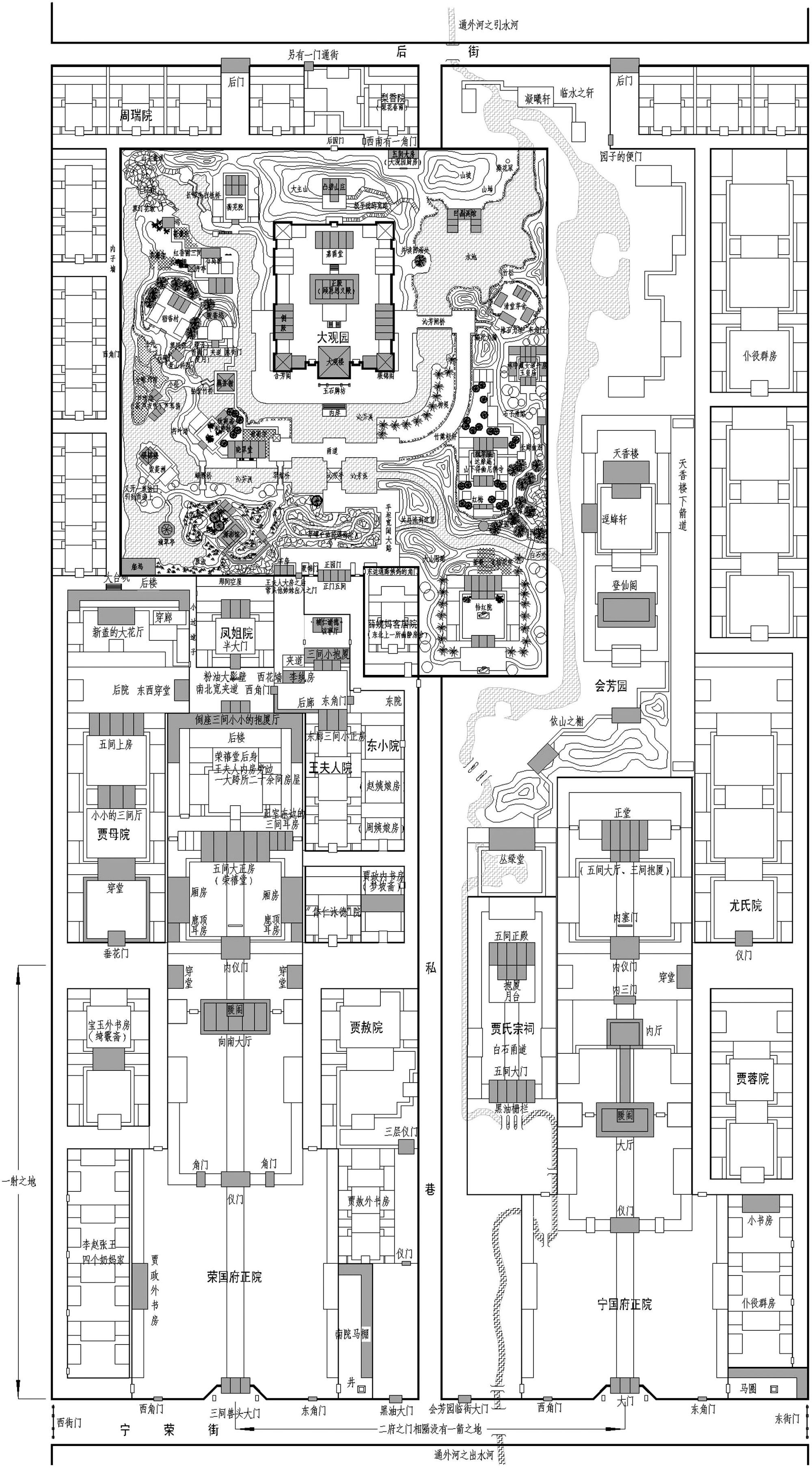 唐《黄帝宅经·序》有云:“夫宅者,乃是阴阳之枢纽,人伦之楷模。非夫博物明贤,未能悟斯道也。”“阴阳”谓天地内外开合,“人伦”辨尊卑长幼亲疏。贾府府邸布局集中体现了中国古典建筑布局严格遵循礼法的基本特点。