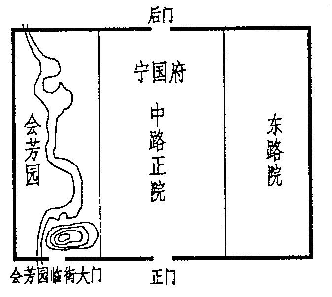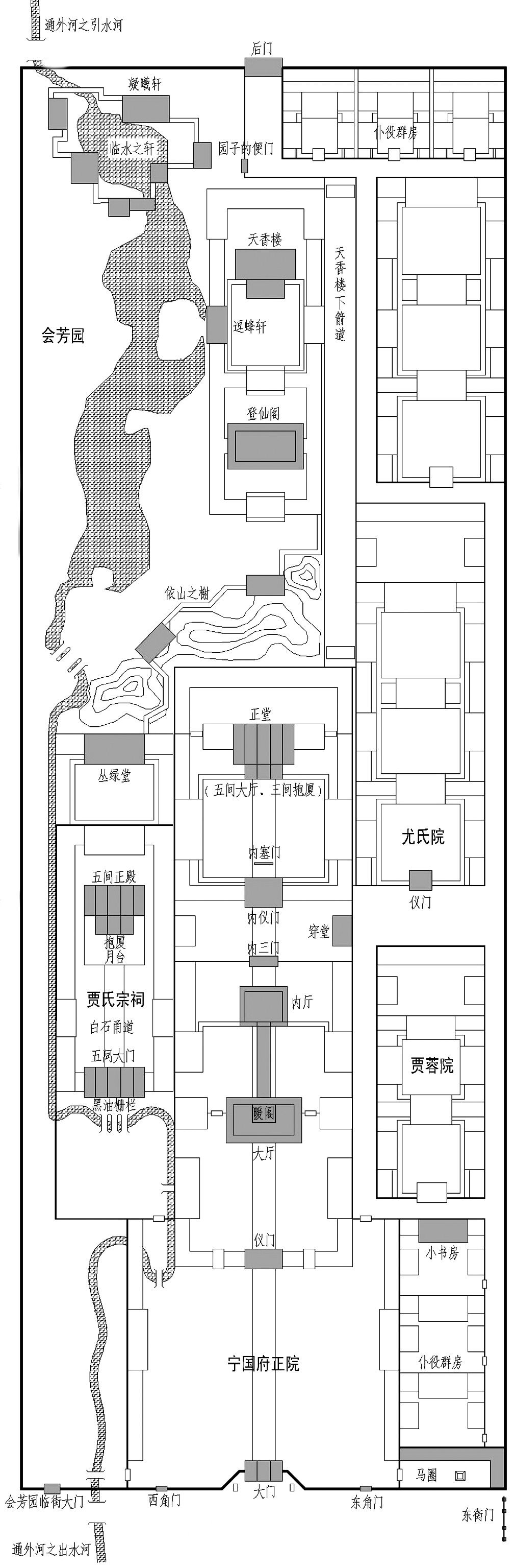 宁国府门前“蹲着两个大石狮子,三间兽头大门……正门却不开,只有东西两角门有人出入。正门之上有一匾,匾上大书‘敕造宁国府’五个大字”。(第三回)宁国府在《红楼梦》中篇幅不大,描写语焉不详,因为故事主线并不发生在这里,所以对其中的建筑院落均是泛泛而谈,建筑的很多内容是缺省的,方位、规制、室内陈设均处于很不明晰的状态。可知的是,它分为府邸和花园两部分,花园名为“会芳园”;比较确定的,是中轴线、贾氏宗祠和会芳园的位置及部分陈设布置。