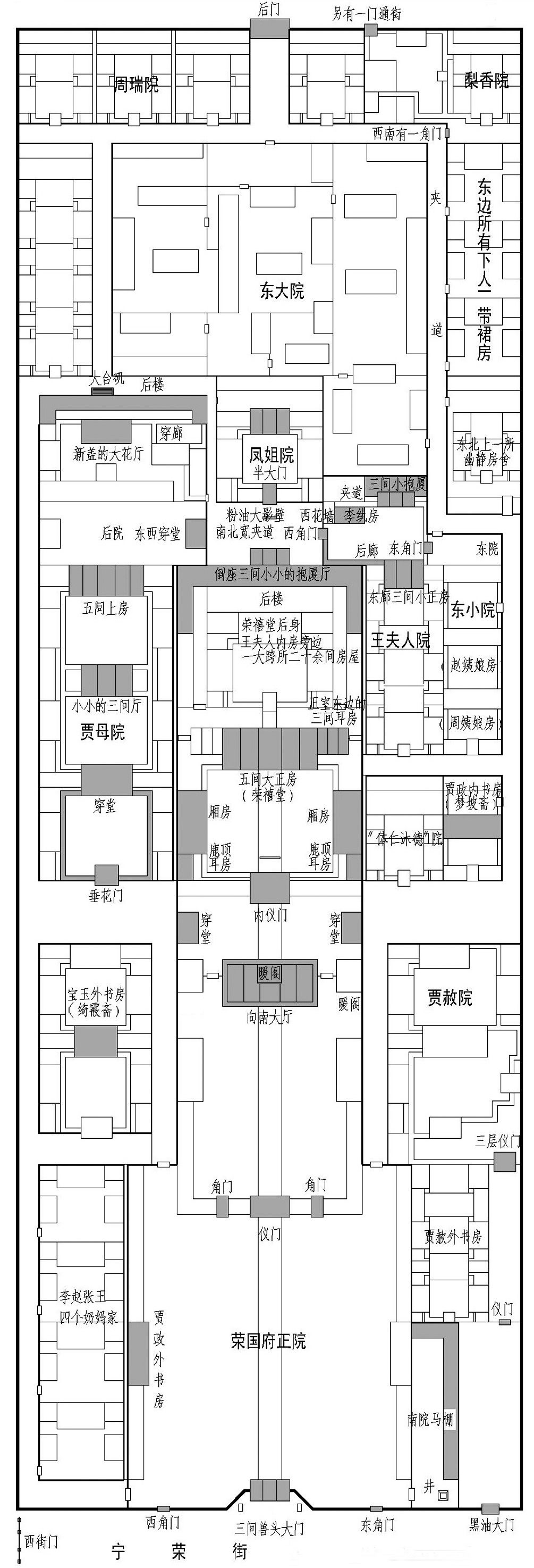 相对而言,荣国府的笔触要浓墨重彩得多了。曹公用力的不均,在于荣国府是故事发生、演进的主场,宁国府则相对处于宾衬的地位。荣国府的主要院落和交通往来路线都有相对清楚的描述,这些场景构成了人物活动和性格发展的自足空间。
