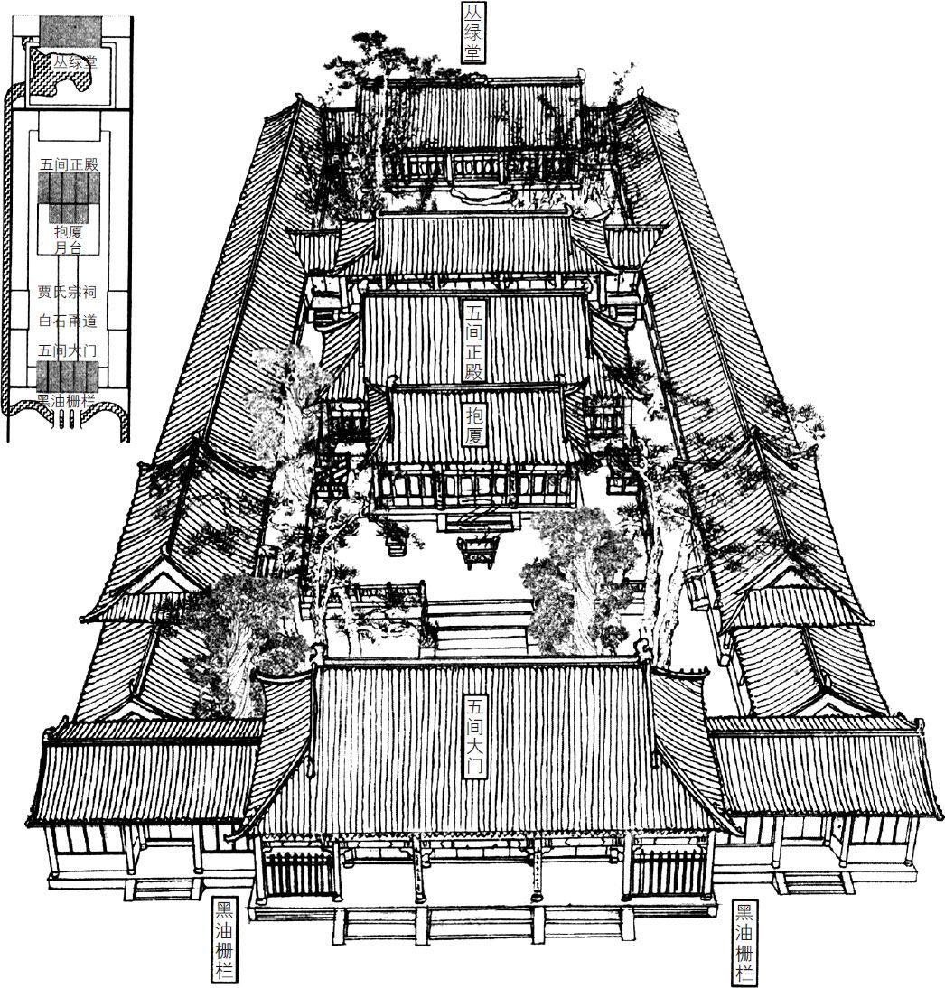 宁荣二府细节或有差别,但与当时王府建制一样,都有一个核心格局,即“前堂后寝”的纵向院落序列,这一点与宫殿的前朝后寝的意义是一致的。前堂是临政理事、接待宾客、进行重大礼制活动的场所,主要建筑称为“厅”,如书中写的“大厅”“向南大厅”等,均指此类建筑,它们是府邸中对外敞开的具有威仪和权重的空间。后寝是主人及其眷属生活起居之所,庭院深深深几许,私密性很强,外人是不得随意进入的,其主要建筑称为“堂”,女主人亦可延请女宾于此,如书中所写“上面五间大正房”“正堂”等。按照礼制,严格区分主次内外,贾府同当时的贵邸巨宅大致相同,外部封闭的宅墙将内部开敞的院落群紧密护卫在其间,前厅后堂的主建筑四周,又有许多附属建筑和院落围绕,如“贾母院”“王夫人院”“凤姐院”“贾赦院”等等,既集中又灵活,既秩序谨严,又巧妙穿插,构成巍巍一座荣国府。