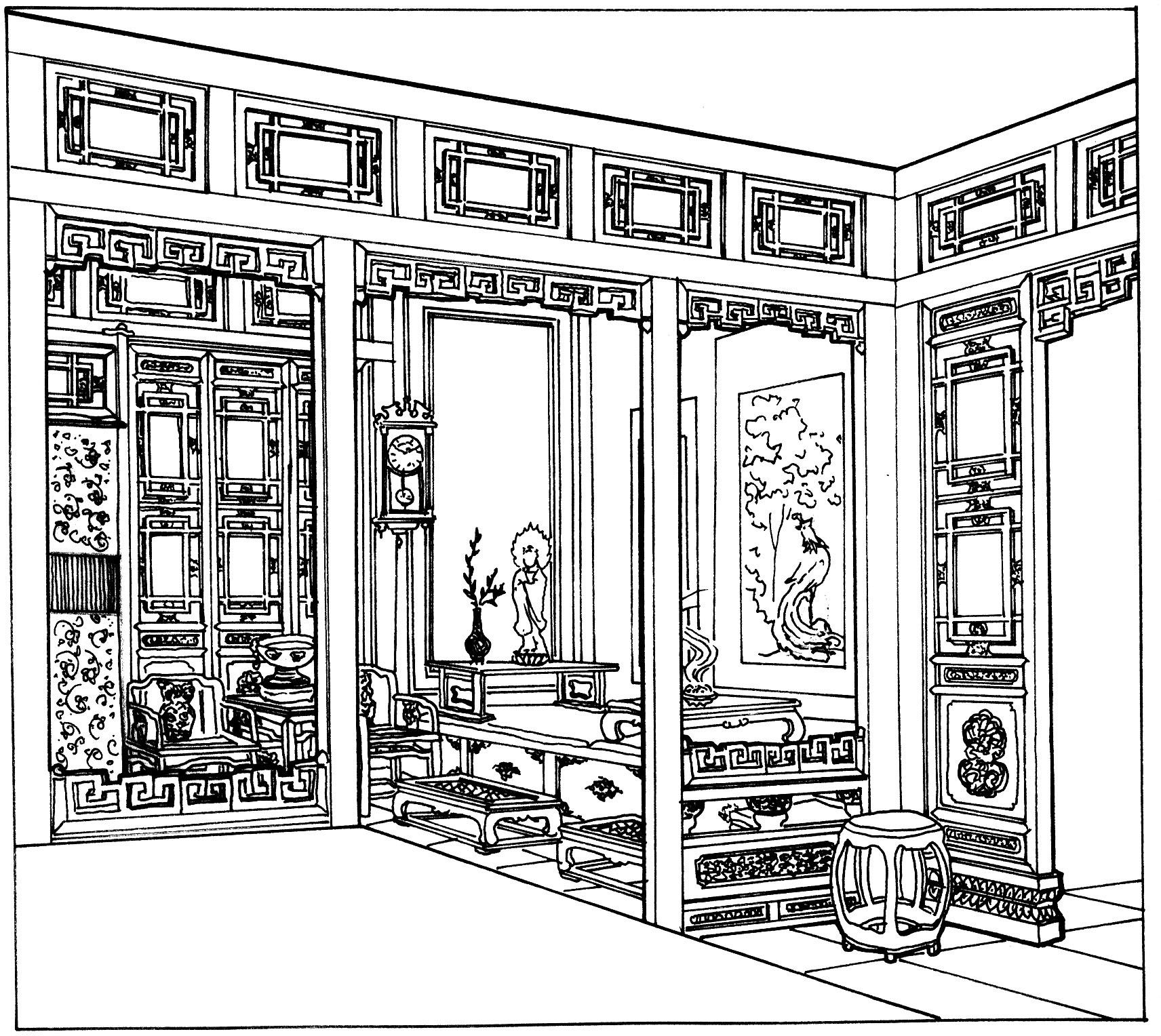 凤姐室内陈设。迎门的挂钟报时的声音唬了刘姥姥一跳