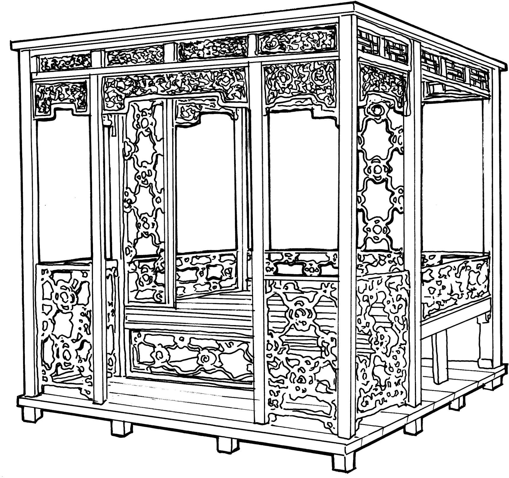 整体布局所造成的环境空间犹如房中又套了一座小房屋。拔步床下有地坪,带门栏杆,大有“床中床、罩中罩”的意思